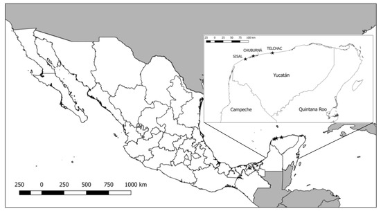A multiple case study was developed in three coastal communities in the central portion of the state of Yucatán—the ports of Sisal, Chuburná, and Telchac (Figure 1). These communities were chosen for their proximity to the city of Mérida, as the most urbanized area in the region, with frequent movement of people to and from the study sites as traditional recreational ports for the population.