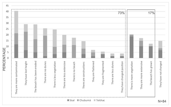In Chuburná, the stakeholders perceived that dunes have been lost, and in Telchac, most of them observed that the coastal dunes are more contaminated (p < 0.01). They also considered that the dunes have lost height and indicated that the coast has eroded (Figure 5). This is reflected in the following quote: