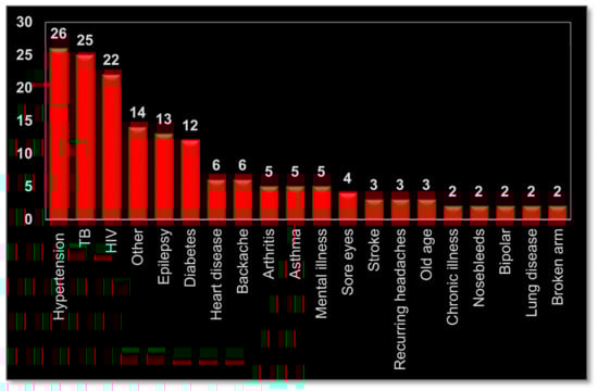 In addition, other variables received smaller percentages of responses, as shown in Figure 1. The following seventeen response categories all received less than 9%: “other” 8.7%; epilepsy 8.1%; diabetes 7.5%; heart disease and backache 3.7% each; arthritis, asthma and mental illness 3.1% each; sore eyes 2.5%; stroke, recurring headaches and old age 1.9% each; chronic illness, nosebleeds, bipolar, lung disease and a broken arm 1.2% each (Figure 1). The illnesses specified under the response category “other” were pneumonia, painful joints, bronchitis, swollen neck, stab wound on left arm, swollen legs, grant-in-aid for caring for a daughter with disabilities, amputated finger, accident, broken knee, numb feet, broken leg, left hand not working and knee pain (not indicated in Figure 1). From Figure 1 it is noted that manageable chronic illnesses like hypertension, diabetes, HIV/AIDS and TB are the main reasons adult PWDs apply for social grants for adult PWDs. In an additional question, a significant number of respondents (n = 166 or 60%) indicated that social grants for adult PWDs were a source of income for those unable to support themselves due to impairment.
