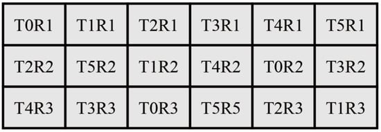 The design of experiment in the field. Three replicates were applied for each treatment and T represents treatment and R represents replication.