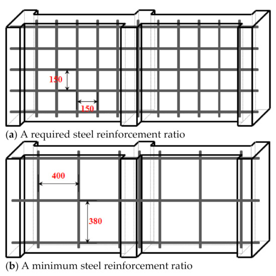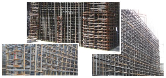From the late twentieth century, newly projected constructions of high-rise buildings gradually expanded from the West to Asian countries, accompanied by industrial development and an increase in city populations in the region. Additionally, climate change worldwide has resulted in the increase in unexpected disasters such as earthquakes, tsunamis, typhoons, and abnormal storms and wind, especially in Central and East Asia. For this reason, the designed load level of wind and seismic forces for buildings and infrastructure has become progressively higher to secure structural safety performance. In the construction of high-rise building structures, reinforced concrete (RC) shear walls are effective in improving lateral stiffness and load-carrying capacity under earthquake and wind loads [1,2,3,4,5]. The tensile strength of concrete is much lower than its compressive strength: concrete is brittle under tension, and cracks develop easily under lower tensile stress. In conventional RC shear wall design, the deficiency of concrete under flexure should be covered by horizontal and vertical reinforcements and died bars in special boundary elements [5,6,7,8]. According to the level of seismic design, as shown in Figure 1, the spacing of reinforcing steel bars should be very narrow and complicated with tight spacing of tied bars as the case of seismically special RC shear wall design [1,2,6,7,8].