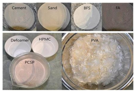 SHCC was mixed with a targeted slump flow of 600 mm by polyvinyl alcohol (PVA) short fibers, ordinary Portland cement (OPC), fine aggregates of maximum grain size 0.25 mm, water, a high-range water-reducing admixture, and admixtures to improve the fresh properties of the SHCC [12], as shown in Figure 2 [13]. PVA fibers had a length of 12 mm and a tensile strength of 1600 MPa, with the surface treated by an oiling agent, as shown in Table 1. A polycarboxylate superplasticizer (PCSP) was added for the fluidity of the cement as well as the dispersibility of fibers, while hydroxypropyl methylcellulose (HPMC) was applied to prevent the segregation of materials such as silica, fly ash (FA), blast-furnace slag (BFS) fine powder, and fibers. Antifoaming agent was also applied to finish the surface and control the air content [13].