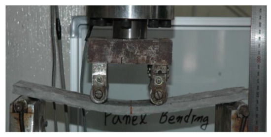 From compressive tests on cubic molds, the compressive strength of SHCC at 28 days was measured as an average of 38.4 MPa. From direct tensile tests, each specimen reached failure after multiple microcracks accumulated on the surface, as shown in Figure 4. The stress at initial cracking, the maximum tensile stress, and the ultimate tensile strain were measured respectively as shown in Table 3. After reaching the cracking tensile stress, the SHCC showed not a brittle but a high-ductile characteristic as the measured tensile strain of each specimen was more than 3.0%, which was caused by multiple microcracks as shown in the crack propagations. The high-ductile and deformation capacities of the current SHCC was also demonstrated through the panel bending test, as shown in Figure 5. The SHCC panel showed a largely deflected shape instead of a sudden failure, which occurs soon after an initial crack in concrete.