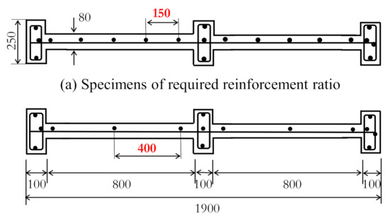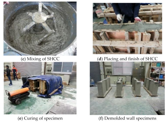 Two specimens of RC walls and four specimens of R-SHCC walls were manufactured following the process shown in Figure 8. Reinforcing steel bars were cut and assembled to fit the dimension and spacing of bars for each specimen, and then settled into each wood formwork, retained the cover with concrete. Each formwork was sufficiently supported by wood square bars in order to prevent side pressure on the formwork during the concrete-pouring process. Fresh SHCC or concrete was poured and compacted to divide into three layers to prevent segregation and poor compactness. After the finishing of fresh SHCC or concrete, each specimen was cured and demolded from the formwork after seven days of curing and continued to cure under wet conditions.