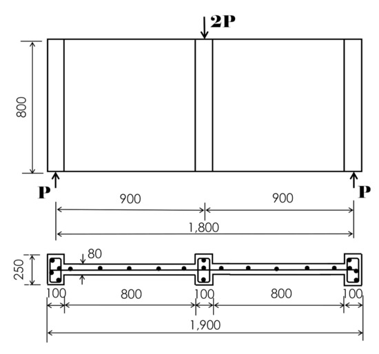 Wall specimens were tested by a three-point loading setup under a simply supported condition, as shown in Figure 9. The pure span length between two supports of both ends was 1800 mm and a transverse load at midspan was applied until each wall specimen reached failure. The loading test was set up on a universal testing machine (UTM) which had a capacity of 1000 kN, as the photos show in Figure 10. The transverse deflection at the midspan was measured using linear variable differential transducers (LVDTs) installed on the midspan bottom surface in the vertical direction. On a surface at 400 mm away from the bottom of midspan, three LVDTs in horizontal, vertical, and diagonal directions were installed, separately, as shown in Figure 10, to estimate the opening of local shear cracks of the wall. Steel gauges were bonded to horizontal reinforcing steel bars both on the top and bottom at midspan.
