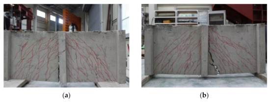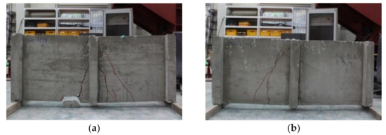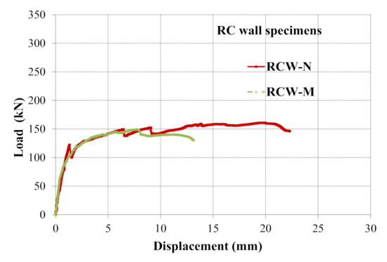 The RCW-M specimen showed nearly the same tendency to predict a load and deflection curve until reinforcing steel bars initially yielded, but a few local cracks produced by shear prominently occurred on the surface of the concrete wall in the diagonal direction. Cracks initiated at a load of 25 kN and shear cracks expanded according to the increase in load. Both the maximum load, which was recorded at 149 kN, and the deformation capacity were lower than those of RCW-N. RCW-M finally reached shear failure, as shown in Figure 11, by the expansion of the width of local shear cracks. It was attributed to failure by shear because the RC wall specimen was designed with minimum reinforcement ratios both in the horizontal and vertical directions.