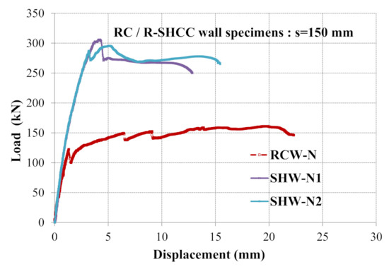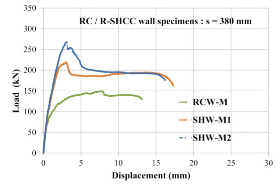 For specimens designed with minimum reinforcement ratios in both the horizontal and vertical directions, it was demonstrated that compared with specimens of RC walls, specimens of R-SHCC walls showed reliable structural responses in the control of bending and shear cracks on surfaces of the wall and the increase in the overall load-carrying capacities of the wall. Despite minimum reinforcement ratios, the use of SHCC in a wall showed improved responses to minimize damage and failure caused by localized cracks under bending and shear compared with the use of normal reinforcement ratios in an RC wall.