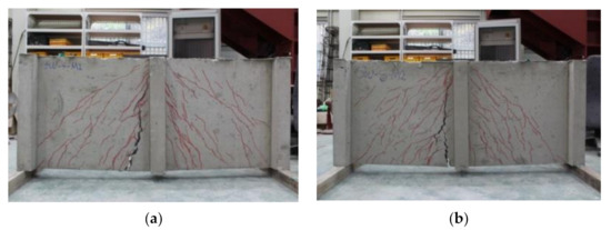 Two specimens of R-SHCC structural walls, SHW-M1 and SHW-M2, were designed with minimum reinforcement ratios and their cracks and failure patterns are shown in Figure 15a,b, respectively. For the two specimens, multiple microcracks induced by shear in the diagonal direction and bending in the vertical direction widely spread on the SHCC wall surface. As observed in SHW-N1 and SHW-N2, until a yield load was reached, the degradation of the transverse stiffness of the wall was less compared with the specimens of RC walls, and crack localizations were also not observed. Despite minimum reinforcement ratios, with spacing of 380 and 400 mm in the horizontal and vertical directions, respectively, the cracked stiffness of the wall was not seriously degraded because the SHCC sufficiently restrained openings and localizations of cracks. As shown in Figure 16, the maximum transverse load was at 219 and 264 kN for SHW-M1 and SHW-M2, respectively. These decreased once after a maximum load but a highly ductile deformation response was sustained until the failure of the wall was reached by the opening of localized bending cracks as seen in SHW-N1 and SHW-N2, which were designed with normal reinforcement ratios.