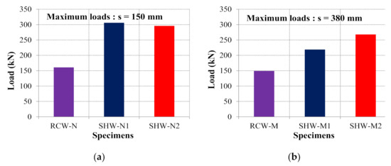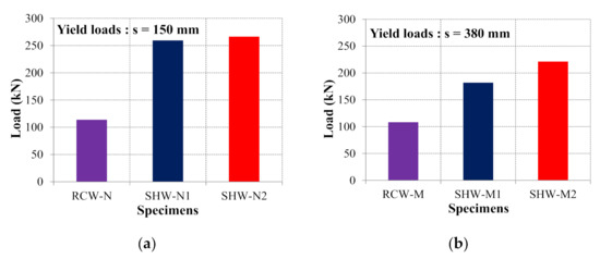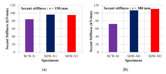Transverse yield and maximum loads for six specimens of RC or R-SHCC walls were compared, as shown in Figure 17 and Figure 18. For both cases of walls designed with normal and minimum reinforcement ratios, the load levels of R-SHCC walls at yielding and ultimate stages were higher than those of RC walls. The values for R-SHCC walls exceeded those of RC walls in yield and maximum loads for walls designed with normal reinforcement ratios by 2.3 and 1.81 times, respectively; and by 1.87 and 1.62 times for walls designed with minimum reinforcement ratios, respectively. Similar tendencies were also observed in the comparison of the secant stiffness of each wall, as shown in Figure 19, in which the secant stiffness of a wall was calculated from the load and displacement curve between zero and a yielding point. The two R-SHCC walls compared with an RC wall had 1.14 times higher normal reinforcement ratios and 1.52 times higher minimum reinforcement ratios. Despite minimum reinforcement ratios, SHW-M1 and SHW-M2 R-SHCC walls showed excellent structural performance in load-carrying capacities as well as in maintaining a sufficient stiffness after cracks occurred compared with a specimen of RCW-M. Applications of SHCC to structural walls demonstrated that SHCC had advantages in controls of bending and shear cracks, retardations of crack localizations, and minimizations of reinforcing steel bars.
