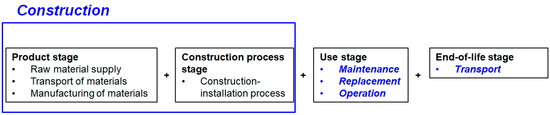 The methodology of the Architectural Institute of Japan (AIJ) [30] was adopted. The building life-cycle phase consists of construction, operation, maintenance, replacement and disposal as system boundaries. Figure 1 shows the system boundaries considered in the methodology. The presented display is based on the European standard [29]. The blue italic words are the boundaries considered in the methodology of the AIJ. It is noted that the construction phase is composed of the product and the construction process stage.