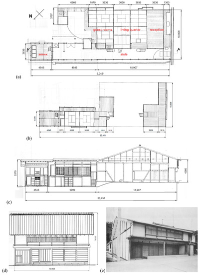 Sanayama residence (SA-RES) [67]: (a) ground floor plan (unit: mm), (b) first floor plan, (c) AA’ section, (d) south elevation, (d) façade and (e) state just after the restoration in 1977 (a picture taken from the south). ((a–d) modified by the authors).