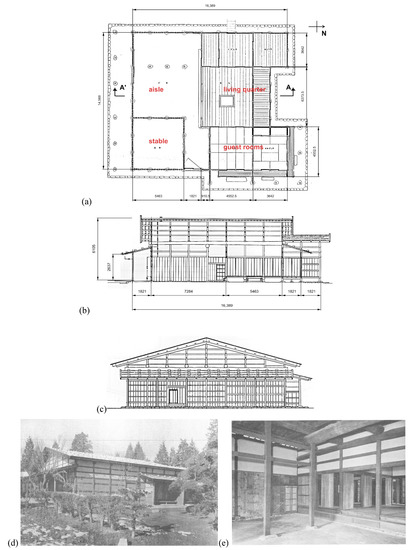 Sonehara residence (SO-RES) [68]: (a) ground floor plan (unit: mm), (b) AA’ section, (c) east elevation, (d) state just after the restoration in 1977 (a picture taken from the southeast) and (e) interior view from the aisle ((a–c) modified by the authors).