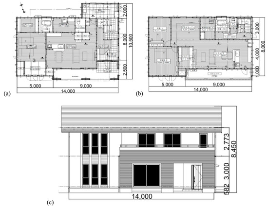 A two-storey house was chosen as the case study of new construction (Figure 3a). In this paper, it is named the contemporary house as a comparison to the heritage houses introduced in Section 3.1. A detailed description of the house can be found in the publication of [77]. It is situated in Nagano prefecture. It was built in 2016. The structure is composed of timber frames. The roofs are covered with galvalume panels. The walls are composed of plasterboards, cement siding and spray foam. The dimension of the ground floor is 14.0 × 10.5 m2 in plan (Figure 5a). The height of the ground floor is 3.0 m while that of the first floor 2.7 m (Figure 5b,c). The gross floor area is 213.0 m2. The ground floor consists of a living room, a kitchen and a principal bedroom. The first floor has bedrooms for family members and guests. The building was chosen as the case study for its typical room layout as a contemporary detached house in Japan [78,79]. The gross floor area is nearly twice larger than that of typical houses, which is about 125 m2 [78]. Thus, the contemporary house has a close gross floor area to the studied heritage buildings. Typical domestic appliances are installed as a contemporary house in Japan [80,81] (see Table 4). Table 5 shows the amounts of principally used materials. As for timber, cedar was mainly used while pine was used as beams and joists. Interior timber panels were used as the interior decoration of the house.