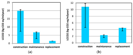 Life-cycle CO2 (LCCO2) of the construction, maintenance and replacement phases: (a) SA-RES and (b) SO-RES.