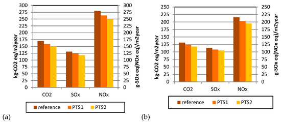 The second sensitivity analysis was conducted by proposing different technical systems. Two combinations of the technical systems were proposed (Table 7). Proposed technical system 1 (PTS1) considered that the studied houses were equipped only with electrical appliances. Proposed technical system 2 (PTS2) considered an advanced technical system. It includes a polymer electrolyte fuel cell (PEFC) cogeneration system and a heat exchange system. The two systems were determined, taking into account domestic appliances found in typical contemporary houses in Japan [83,84]. In addition, they can be easily removed and have limited impacts on the appearance of heritage buildings. The results of PTS1 and PTS2 are compared with the reference cases which were presented above (Table 8). PTS1 saved around 6.0% of energy compared to the reference case in both heritage buildings while PTS2 10.0% (Figure 7). The other indicators (CO2, SOx and NOx) showed similar reduction rates.