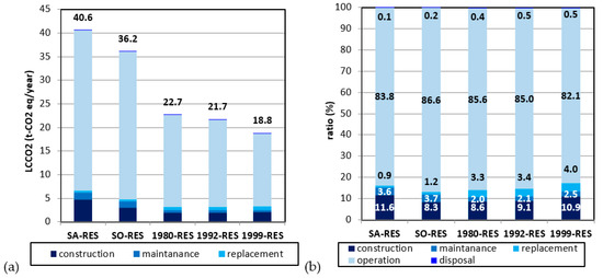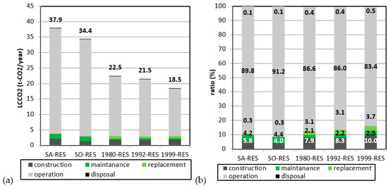 LCCO2 of the studied houses for the reference study period of 100 years: (a) yearly CO2 emissions and (b) their ratios.