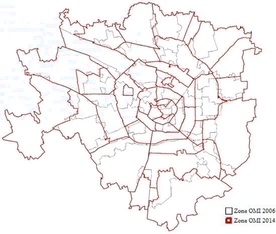 The change of the homogeneous divisions is evident in the figure below. Given the considerable change in the area and their shape and coverage, the average prices from 2006 to 2013 will not be considered for the analysis in this dissertation. A study of the consequences of the change of OMI areas was already presented in the context of Research Project of Relevant National Interest—PRIN “Metropolitan cities: territorial economic strategies, financial constraints and circular regeneration” [34].