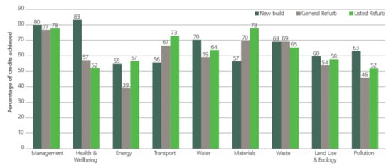 Credits attained by new builds and retrofits, by category, under BREEAM; © by BREEAM.
