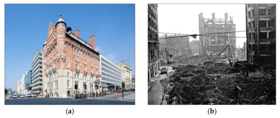 30 James Street in its context: (a) Contemporary building after refurbishment, 2019; (b) 1940s resultant structure remaining after Liverpool air raids; © by Signature Living.