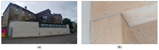 As discussed in the introduction, embodied carbon can account for as much as 70% of whole life carbon in modern buildings, which can be predominantly addressed in the materiality and construction methods of a building project. The greatest asset of existing buildings over new builds is their ability to reuse built fabric, creating minimal embodied carbon through the manufacturing of new materials. Much of the ECCI’s existing fabric was retained, including the structure and cladding of external walls and floors. Construction of the new extension was further built on a timber frame, and much of the interiors were clad in timber from renewable northern European forests (Figure 8). The major benefit of this is that wooden products are often carbon-positive, absorbing more CO2 in their growth than released during their manufacture, installation, and dismantling. The Cross Laminated Timber (CLT) structure was estimated to have captured 4–5 times more carbon than emitted [26]. Furthermore, the local sourcing of timber and stone considerably reduced transport emissions, contributing to a lower embodied carbon. This attention was further extended to the fittings, incorporating all steel power outlets and timber furniture, amongst other efforts.