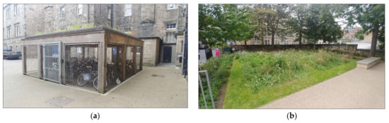 Landscaping in the ECCI’s grounds; (a) Green roof over bike storage; (b) Wild grass meadow planting in garden spaces; author’s photographs.
