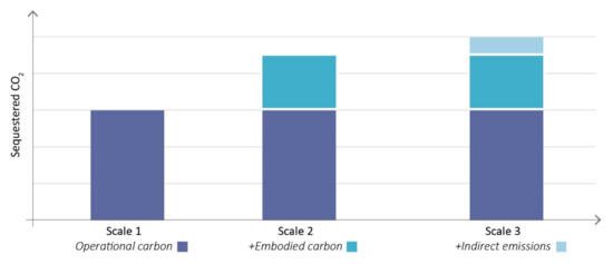 - Scale 2—Including embodied carbon: the harvesting, manufacture, and transport of materials are considered, in addition to building construction and demolition. These issues are addressed through sensible material sourcing, efficient construction, and carbon offsetting—through renewables or third-party involvement.