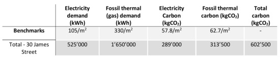 Energy & carbon calculations for sustainable development strategies at 30 James Street; author’s work.