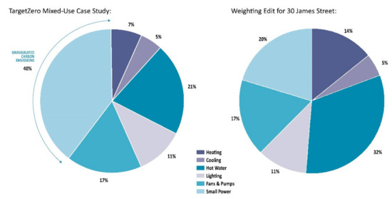 The calculated figures divide carbon emissions between fossil thermals (natural gas heating) and electricity. To give this context, it is useful to understand the CO2 emissions breakdown in the building by sector. Adjusting the measured performance of a mixed-use case study allows estimates for 30 James Street to be made (Figure 14) [32]. The adjustments are: small power (TVs and appliances) is halved due to the function of 30 James Street as a hotel; heating is doubled, to account for poor thermal performance; and hot water is increased 50%, acknowledging the basement spa.
