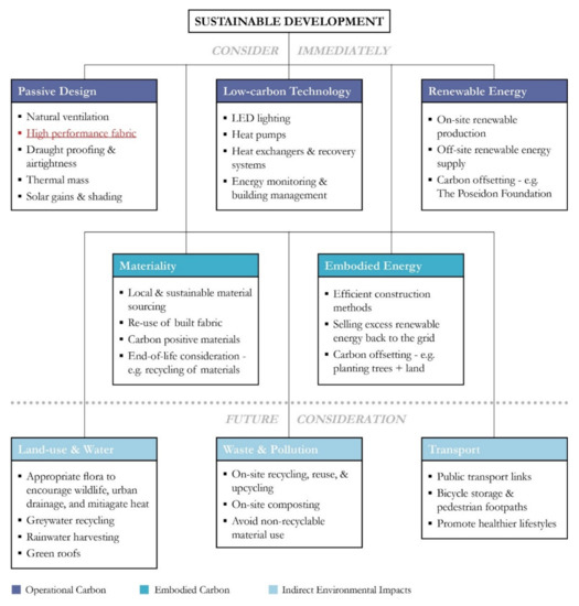 Alternatively to on-site renewables, many power suppliers offer opt-in services for purely renewable energy supplies. In these contracts power still comes from the grid, but energy bills fund the development of new renewable energy generation. SSE supply one such scheme authenticated by Ofgem (HM Government’s gas and electricity regulator) [28]. Additionally, companies such as The Poseidon Foundation use carbon offsetting to counterbalance the emissions of a project by funding carbon-positive agendas worldwide, including reforestation and the supporting of local communities to reduce dependence on deforestation jobs [29]. Although they are valid approaches to counteracting the carbon emissions of buildings, off-site renewables and carbon offsetting should only be resorted to once other pathways have been explored, as they do not tackle the fundamental issue of sustainable development—to reduce carbon emissions.