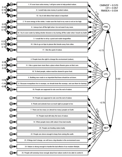 Confirmatory factor analysis to relate the latent factors of the 2-Major Environmental Values model (Preservation [PRE] and Utilization [UTL]) and the NEP (negative items inversely recoded). The unobserved variables (uv) illustrate disturbing factors, which would otherwise affect the measurement. Double-headed arrows are correlations; single-headed arrows represent regression weights (factor loadings). The correlated unobserved variables indicate the first order latent variables of Preservation (Intent of Support, Care with Resources, and Enjoyment of Nature) and Utilization (Altering Nature, and Human Dominance). Fit indices are good with the Chi-Square relative to the degrees of freedom (CMIN/DF) below 5.0, the Comparative Fit Index (CFI) above 0.95, and the Root Mean Square Error of Approximation (RMSEA) close 0.03.