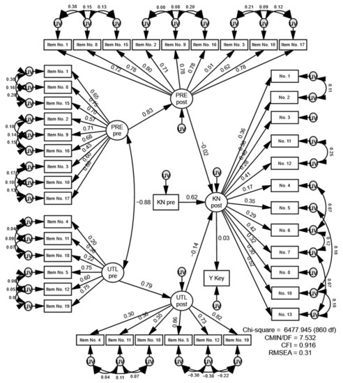 Structural equation model to relate Preservation (PRE) and Utilization (UTL) in a pre-post comparison, and to estimate their effects on environmental knowledge scores (KN). The proxy of behavior (Y key) is the model’s last instance. All ellipses are factor-analyzed latents. The pre-knowledge score is also factor-analyzed, but its item structure is not depicted due to place restrictions. The error terms (uv) are correlated and illustrate the first higher order structure of Preservation and Utilization, which is Support, Care with Resources, and Enjoyment of Nature (Preservation), or Altering Nature, and Human Dominance (Utilization). Fit indices are within the thresholds (the Chi-Square relative to the degrees of freedom [CMIN/DF], the Comparative Fit Index [CFI], and the Root Mean Square Error of Approximation [RMSEA]).