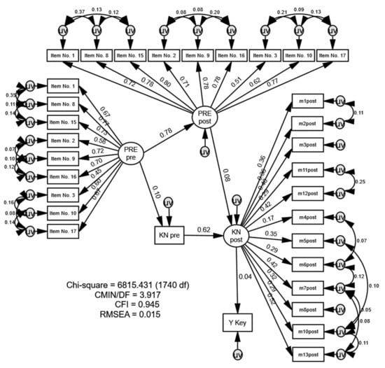 Optimized SEM to relate Preservation (PRE, 2-MEV subscale) to knowledge scores. The multiple group analysis estimates simultaneous fit indices for all models (three state subsamples: AZ, PA, and LA). Error terms (uv) represent disturbing factors. For clarity, the factor analyzed pre-knowledge score (KN pre) is depicted in a rectangle, while all other latent constructs have their factor structure within the model. Fit indices are good with the Chi-Square relative to the degrees of freedom (CMIN/DF) below 5.0, the Comparative Fit Index (CFI) close to 0.95, and the Root Mean Square Error of Approximation (RMSEA) below 0.03.