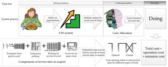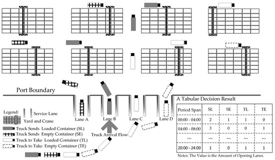 Two components of seaports directly affect congestion in the gate system, namely, the truck appointment system (TAS) and lane allocation planning. The TAS is a widely used system for appointing the period at which trucks can enter the gate, where the opening time of gate, appointment periods and service quota within each appointment period are provided. Some international ports, such as Rotterdam, Shanghai, and Dalian, require trucks to make an appointment 24 h in advance [21]. Trucks can choose the expected arrival period. If there are no available slots in in the expected period, the seaport will require the trucks to choose another period. Thus, the TAS can guide the arrival trucks from the peak period to the off-peak period to some extent [22]. However, it also causes tedious smartphone app operations and represents an irritating experience for truck drivers in the event that they unfortunately appoint the arrival time in an overflow appointment period. Therefore, there is a need for the efficient allocation of lane resources in order to balance arrival flows of different types of trucks. The paper designs a framework to combine the lane allocation problem with TAS (see Figure 1) to try to figure out an effective green lane allocation policy for seaport operations.