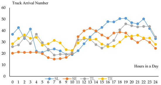 The numerical study selects a container seaport in the south of China. RFID [20,21] recorded the TAS data of this container seaport from 10 October 2020 to 10 November 2020, which contain 83,582 records. These records include information of trucks, e.g., arrival time, in-port time, off-port time, the average tractor weight, the average container weight in loaded, the average container weight in empty, and engine working parameters. The gate system has eight lanes available to serve trucks. The numbers of four types of trucks each 4 h form 0:00 a.m. within a day are illustrated in Table 1, including the maximum number, minimum number and average number. In addition, the numbers of each type of trucks each hour during a day are recoded, which is depicted in Figure 3.