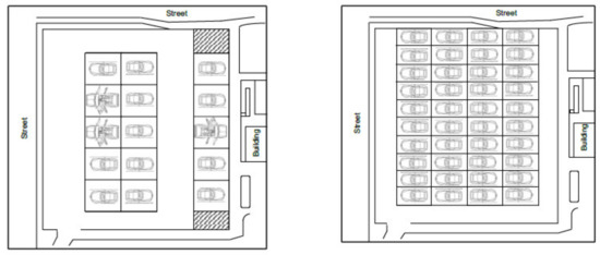 The differences between two parking lot designs: regular parking lot design (left) and autonomous vehicle parking lot design (right), adapted from [66]. Copyright 2021 Elsevier.