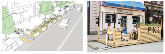 Parking lot conversion: the “51 parklets” project, adapted from [69,70]. Copyright 2021 Island Press (for first figure), 2016 Cincinnati Magazine (for second figure).