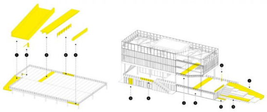 Regarding sustainable issues in retrofitting, Gensler’s “MOD” design concept for a cultural center demonstrated how a parking lot can be transformed into a public space for citizens [77]. Their strategies were to raise the floor height to ensure that the floors are leveled between ramps, and to add cavity panels and install easily removable walls and ceilings to increases light and ventilation. The garage was also equipped with appropriate utility connections to prepare for future workspace or retail use. These design strategies were also employed in the 84.51⁰ Center and Netflix headquarters office building parking spaces [78] (Figure 3). In addition to Gensler, a number of other prominent design firms also actively explored, and ultimately realized, the “future-proofing” concept in parking design. For example, WGI [79] (an American design and professional services firm leading in technology-based solutions for the construction of public infrastructure) designed The Wedge, which utilized an adjacent existing parking structure for access, negating the need to build ramps between floors in the new structure. Kasian and 5468796 [80] designed 9th Avenue Parkade, which allows for the future conversion of the space into commercial or residential uses through considerations such as increased floor-to-ceiling heights, and a central atrium space for natural light to penetrate the building. Arrowstreet [74] designed the underground parking space of Boston Parcle K, which envisioned a future double-height space that could be created to allow new uses that would engage with street-level retail space. To meet the different functional demands of retrofitting, Dutch designers proposed the use of assembled components (Figure 4) to improve the flexibility of the sustainable renewal of parking structures [81]. Similarly, Gensler is also investigating ways to retrofit old garages with pod-like houses by inserting these residential units into parking structures.