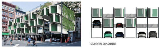 Mechanical parking devices can also be converted for other functions as lightweight structures. Zeroth et al. [82] proposed a design solution for converting a vehicle lift into a housing pod (Figure 5). The scheme adopts injection-molded panels made of recycled plastic, which are prefabricated off-site, then delivered by truck to the parking lot, and lifted into place using a forklift. In high-density urban areas (e.g., Tokyo, Japan), above-ground parking (parking buildings or on-street parking) accounts for a relatively small part of the total parking in urban planning. Instead, a large number of parking spaces are arranged underground. Japanese designers [83] tried to transform underground parking into shopping units. The transformation of underground spaces is challenging owing to the higher requirements of evacuation, fire prevention, etc. In addition, underground spaces usually function as urban shelters. Therefore, there are relatively few cases of such retrofits to date. However, for their significant share of high-density urban parking spaces, their economic potential for retrofitting is gradually gaining attention. In the future, these spaces could be used for urban agriculture, storage, or data centers [77].