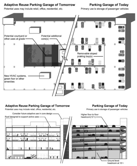 - Cilento, K. Parking Garage Adaptive Re-Use/KSS Architects. Available online: https://www.archdaily.com/65738/parking-garage-adaptive-re-use-kss-architects (accessed on 13 March 2013).