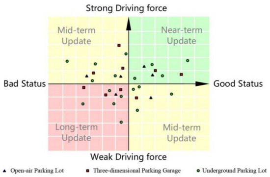 The evaluation index quantification process adopts the assignment method, which classifies each index evaluation level (from high to low) into four categories: highly suitable, moderately suitable, barely suitable, and unsuitable. For each index, it also assigns different scores and employs analytic hierarchy process (AHP) analysis to determine the weight. The renewal timing is determined using the four-quadrant method (Figure 8), which combines the results of the evaluation of the driving force and status aspects of the DSR model. It can divide the existing urban parking space renewal potential (from near-term to long-term) into strong driving force and good status, strong driving force and bad status, weak driving force and good status, as well as weak driving force and bad status. According to the three stages of near-term, mid-term, and long-term developments, the renewal time sequence of each parking space is determined, which can provide a basis for the decision-making of planners and administrative authorities.