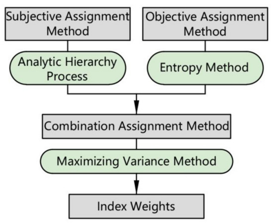 The decision matrix is a mathematical representation of the values obtained from the corresponding attributes of each alternative, which can illustrate the decision information of the alternatives in each indicator attribute. Regarding the requirement for different stakeholders involved in parking space renewal (builders, operators, government departments, users, etc.), two criteria for the functional replacement challenge are proposed: economic and environmental. Furthermore, this study also proposes the two major categories of their corresponding indicators, cost and benefit, and specifically divides them into five attributes: construction cost, operation cost, land cost, overall environment, and internal environmental impact. Owing to the differences in indicators of economic and environmental costs, a combined assignment method is adopted to assign the weight of each indicator, which considers the importance of both quantitative and qualitative indicators (Figure 9), and avoids the limitations of the subjective assignment method.