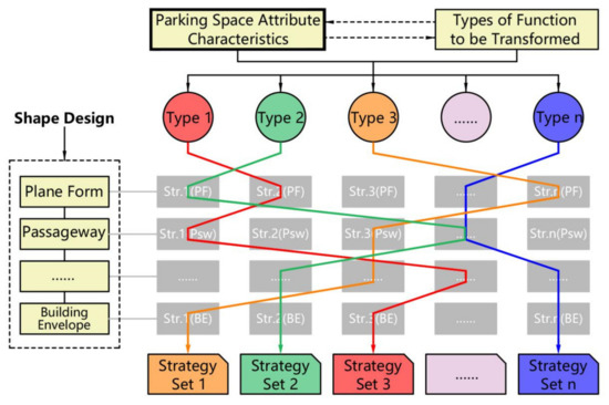 On this basis, detailed case studies and architectural designs of the sustainable renewal of typical cases are to be completed, including functional zoning, entrances and exits, traffic system, fire safety and evacuation, important node spaces, detailed structure, general plan environment, etc. Based on the parking space prototypes refined with general commonality, the research studies and summarizes appropriate strategies for their spatial renewal. In addition, topology is adopted as the evolutionary medium to design a “menu” of various morphological design strategies and spatial organization patterns via the analysis of variable factors, which can provide a basis for professionals (Figure 10). The visualization of this “menu” helps the designers to communicate with the developer and ultimately to make the best choice for the actual design solution according to the diverse realities of the construction site.