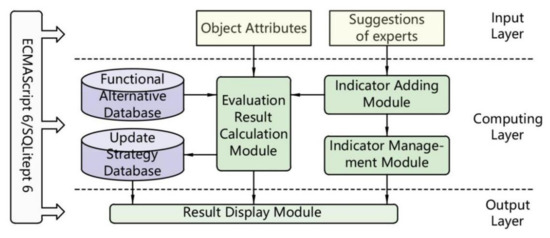 Combining four aspects, including demand forecasting, time-series evaluation, functional replacement, and design strategy, the application system and its interface are developed for the implementation of the renewal project. Its advantage is that it can be used as a working platform for project participants to integrate and share information. The proposed system adopts a hierarchical and modular design. It is divided into four basic modules. The architecture of the application system is shown in Figure 11. The first is the indicator system module, which is responsible for the online creation of new evaluation indicator systems, including the input of indicators, the construction of indicator scoring criteria, and the online calculation of indicator weights. The second is the indicator system management module, which is responsible for managing and viewing the evaluation model. The third is the calculation module, which is responsible for collecting the information of evaluation objects according to indicators and performing comprehensive indicator calculations. The fourth is the result display module, which is responsible for displaying and comparing results for which evaluation and calculation have been completed.