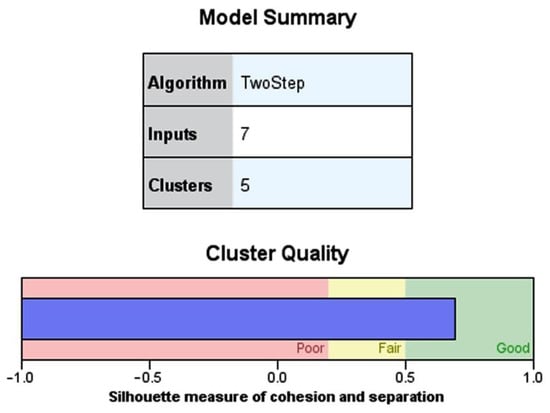 To create clusters of the EU27 capitals concerning city logistics, the logistics determinants (variables) were analysed. Various aspects are essential for the proper functioning of logistics, such as UCCs, restrictions on vehicle entry into the city centre, and low emission zones. The increase in road traffic in city centres has a significant impact on air pollution, the growth of congestion in urban agglomerations, and the quality of life in city centres. Factors that affect the efficiency of distribution in the central urban areas include, for example, the time at the place of loading/unloading, customer requirements, regulatory measures, and traffic intensity, which vary from one EU city to another. The log-likelihood distance measures were computed where all variables were assumed to be independent. The number of clusters was specified manually according to the highest value of cluster quality depicted in Figure 1 (obtained from SPSS). The Bayesian Information Criterion computed a satisfactory quality of the two-step algorithm.