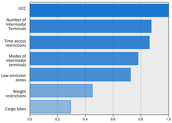Based on the structure of cities, the following qualitative and quantitative variables were used: UCCs, intermodal terminals, modes of intermodal terminals (combination road + rail + barge or road + rail), low emission zones, time restrictions, weight and delivery by cargo bicycles. Figure 2 (obtained from SPSS) illustrates the importance of individual variables based on the BIC.