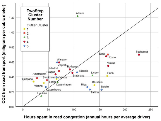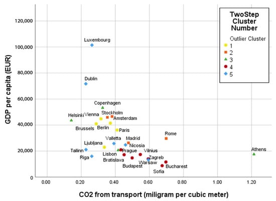 Cities belonging to cluster 1, depicted in Figure 4, produced a relatively low amount of CO2 from transport (from 0.371 mg/m3 to 0.411 mg/m3). The cities from clusters 4 and 5 do not belong to the most developed countries in terms of their GDP, so investments in logistics and various measures are noticeable. Therefore, the amount of produced CO2 is higher. Cities worldwide are increasingly becoming representatives of climate change mitigation, while simultaneously aiming for other goals, such as improved accessibility and clean air [52]. As shown in Figure 4, the lowest CO2 emissions were measured in Helsinki, which belongs to cluster 3, contrasting Athens (from the same cluster) has the least satisfactory air quality. Tallinn, Dublin, Luxembourg, and Riga from cluster 2 have the lowest emissions from transport. Apart from Luxembourg, these cities are coastal, which can have a positive effect on air quality. However, examining the types and number of registered vehicles by age and emission standard should be considered.