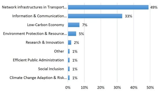 The negative impact of traffic on urban agglomerations is relatively high. Therefore, cities (the relevant city authorities) actively participate in creating projects related to city logistics and urban transport, reducing the negative impacts resulting from the distribution of goods. The EU supports research and innovation in its framework programs [53], as shown in Figure 5, which shows the percentages of European structural and investment projects approved over the horizon (2014 to 2020).