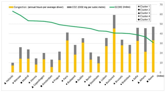 Every city within the EU is unique, and it is not easy to compare them with each other. Each city solves problems related to its traffic jams, air quality, the excessive number of vehicles in city centres, and road traffic safety. The smart city’s concept involves essential transportation solutions that reflect their sustainability, feasibility deployment into full operation, and safety in transport. Concerning the cluster analysis results, it is possible to evaluate SCI respecting the smart mobility score with environmental aspects and road throughput. Figure 6 depicts the grouped graph of the smart city score (green line) by traffic congestions and CO2.