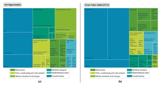 Blue economy (BE) sectors contribution in the EU economy; (a) BE sector contributions in providing job opportunities; (b) BE sector contributions in the gross value added (GVA). Source: [9].