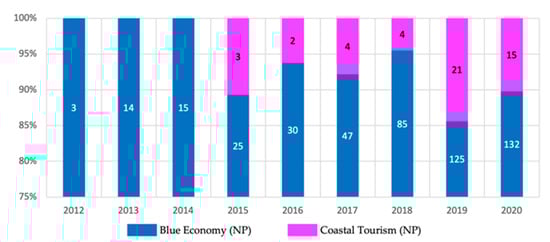Compared to BE, scientific production in the coastal tourism sector was different. The production volume in this sector did not reflect its importance relative to the other six BE sectors, where the number of published articles was 49. According to Figure 3, applying the BE concept in coastal tourism development was not great, especially from 2012 to 2018. The scientific production in this sector stuck on a kind of plateau with about four articles per year. The situation improved in 2019 and 2020, when the number of published papers in the coastal tourism sector jumped significantly to 21 and 15, respectively.